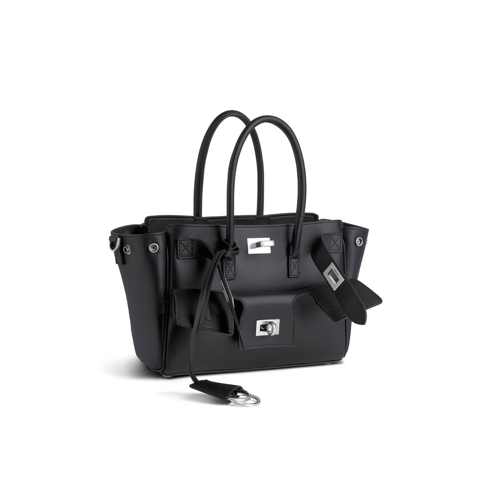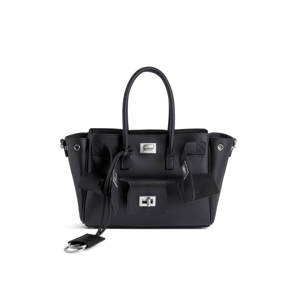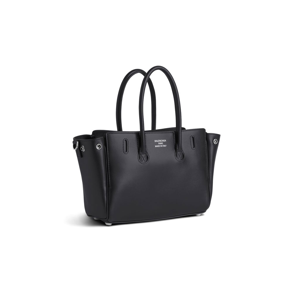 Crafted from smooth calfskin, this versatile bag offers multiple carrying options with dual handles and a detachable strap for shoulder, crossbody, or hand use. It features aged-silver hardware, a turn-lock closure with an engraved logo, and a front pocket. The interior includes a main compartment with two zipped pockets, lined in Nappa lambskin. The Balenciaga Paris logo is debossed at the back.