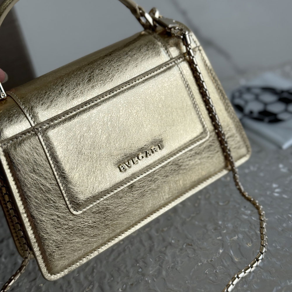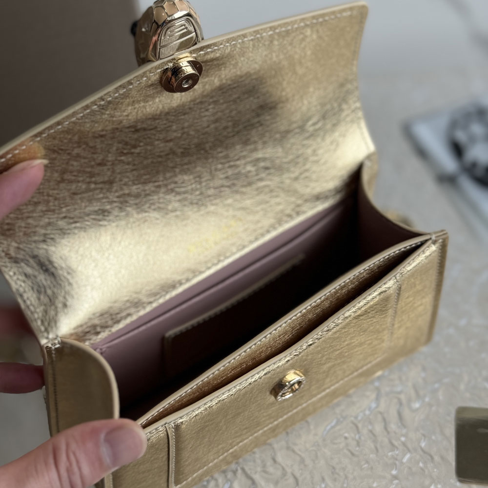 Serpenti Forever mini top handle bag in gold striated calf leather, lined with crystal rose nappa leather.