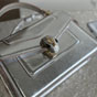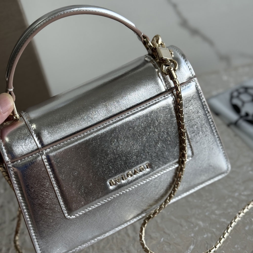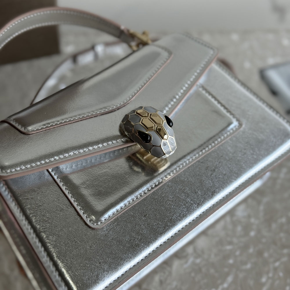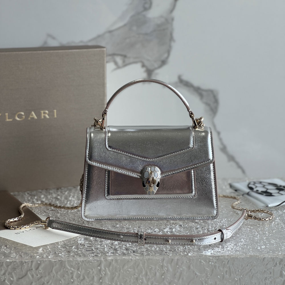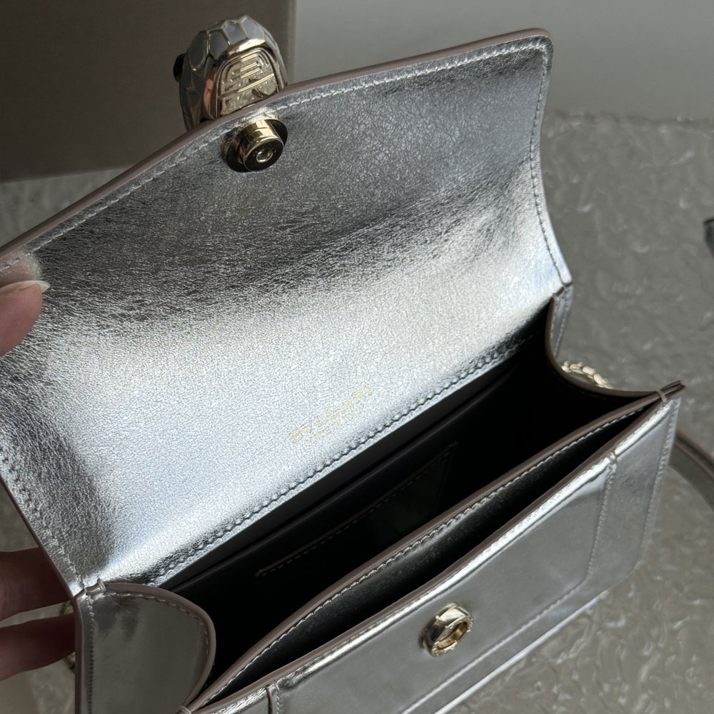 The on-trend Serpenti Forever mini top handle bag is expertly crafted from shimmering silver striated calf leather, evoking the gleam of raw diamonds. Its iconic magnetic snakehead closure, adorned with light gold-plated scales and black onyx eyes, draws inspiration from 1960s Serpenti jewelry. The design includes a versatile chain and leather strap, along with practical interior pockets.