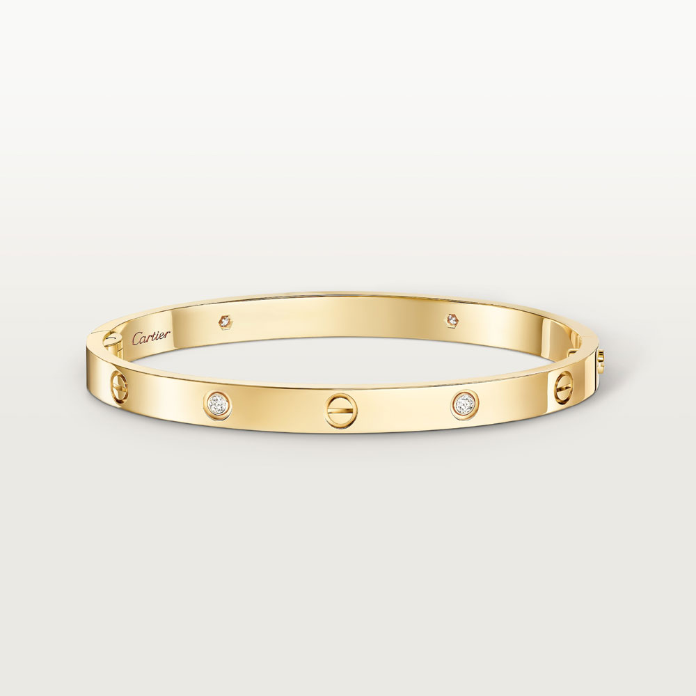The LOVE bracelet, crafted in 1969, reflects Cartier's bold design with its unique screw motif. This 18K yellow gold piece features 4 brilliant-cut diamonds