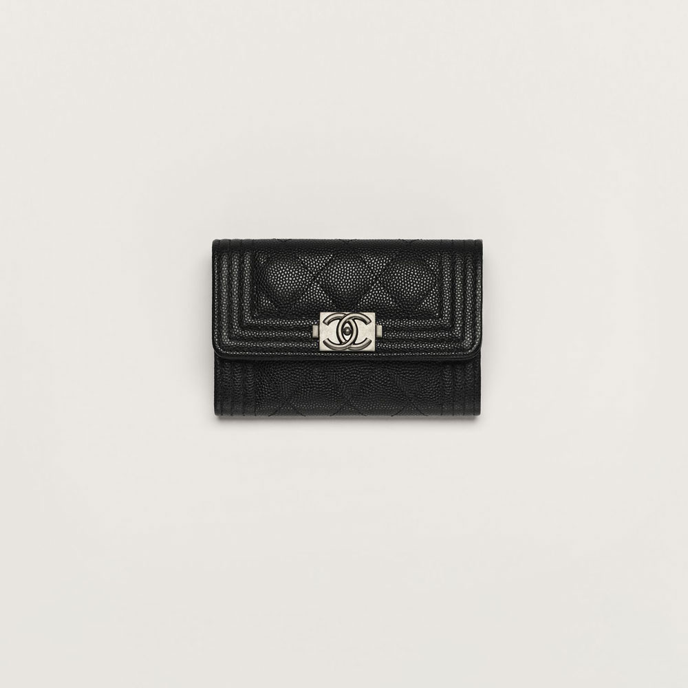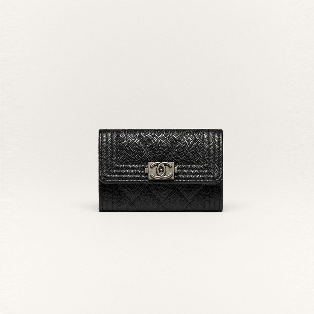 Sophisticated black grained calfskin with polished ruthenium detailsCompact flap-style wallet from the iconic Boy line.
