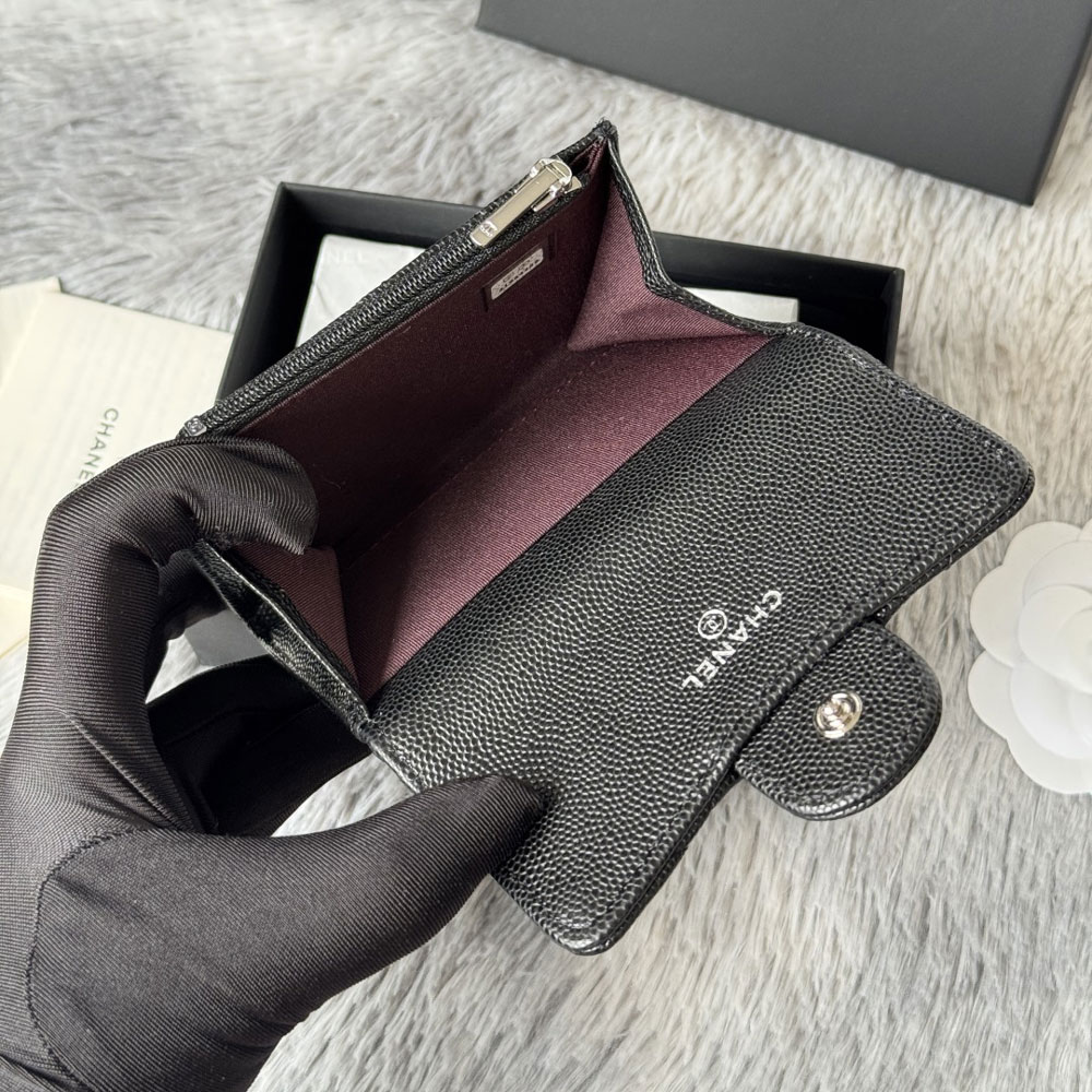 This elegant card case from Chanel, style reference AP4096 B10583 94305, is crafted from a vibrant Black grained calfskin with a luminous shine. It features subtle accents in silver-tone metal for a classic finish.