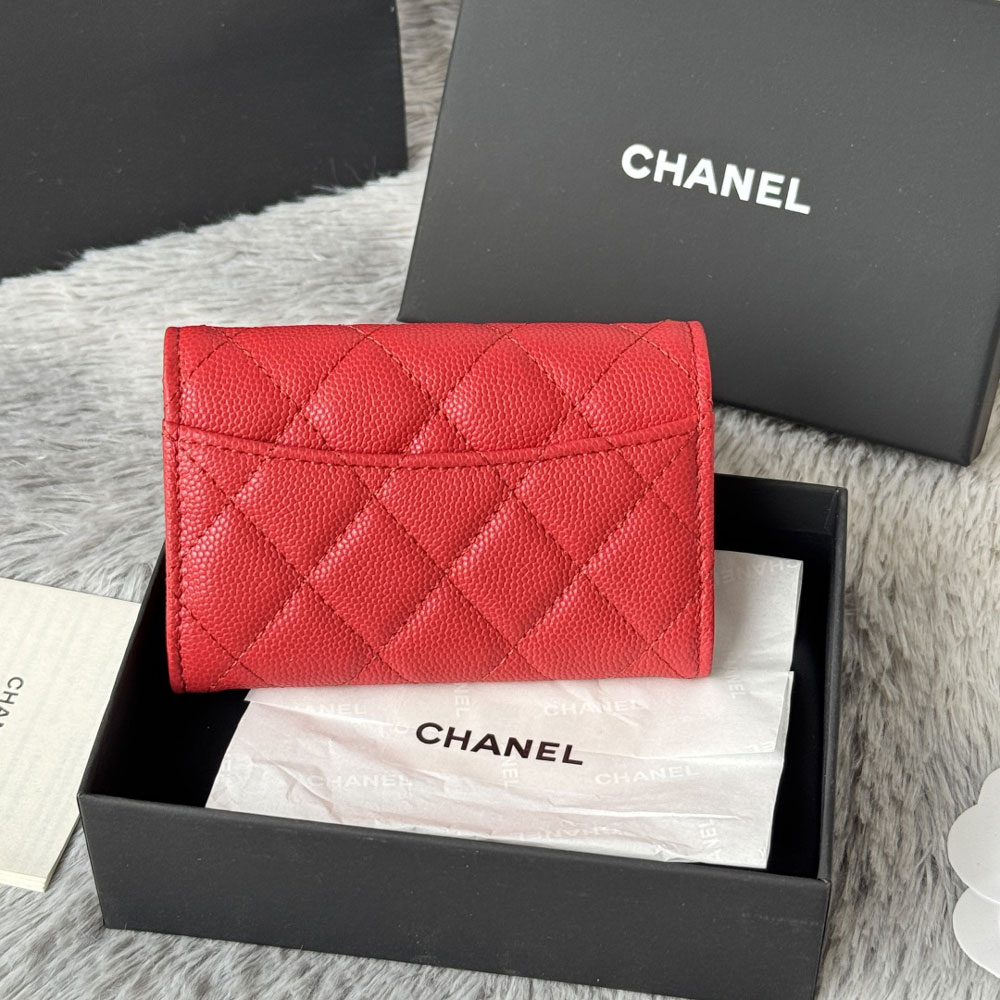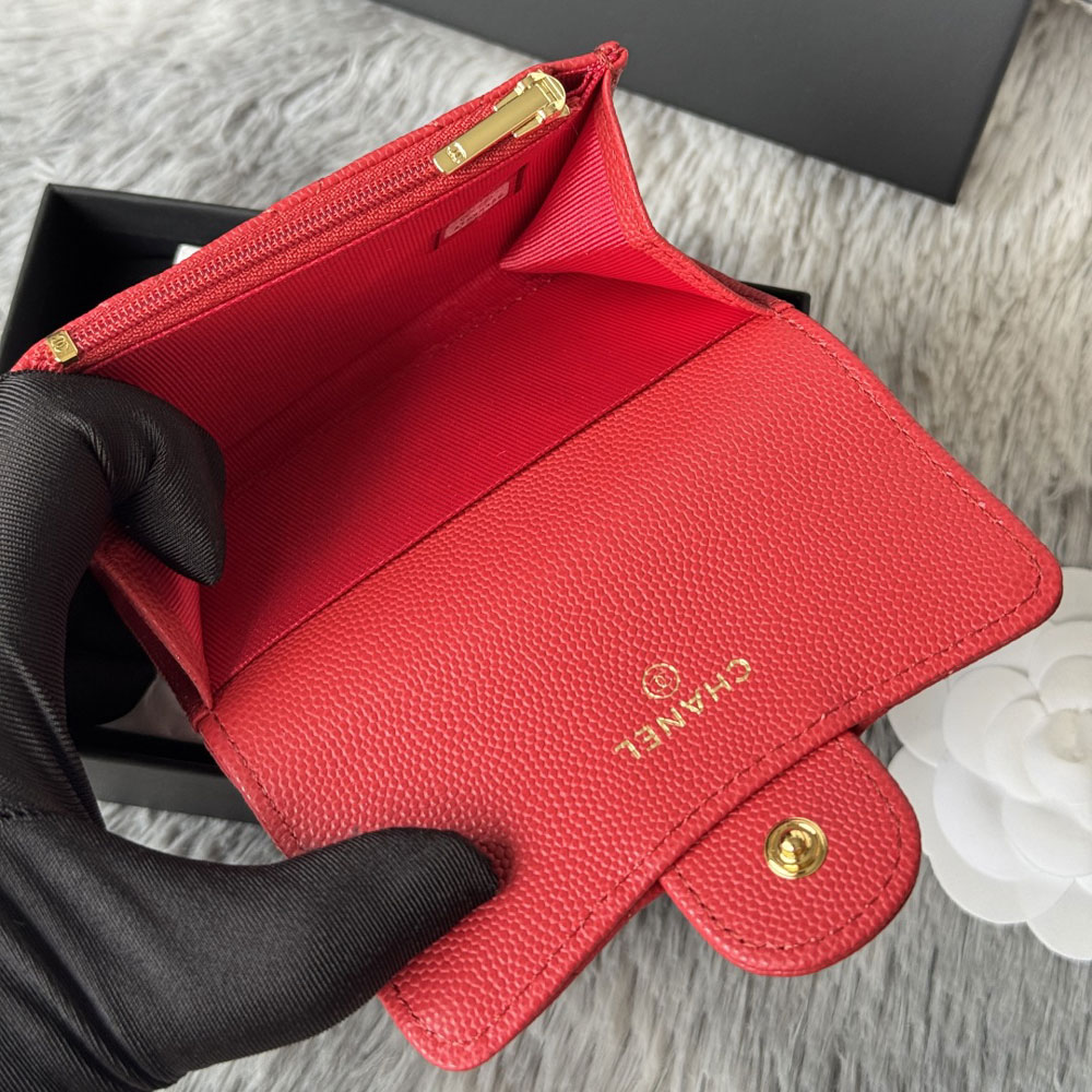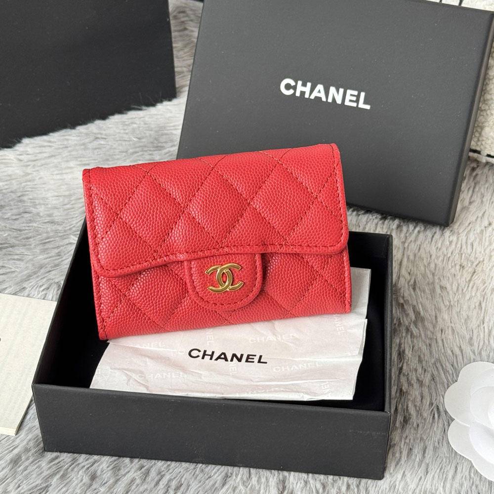 This elegant card case from Chanel, style reference AP4096 B10583 NQ339, is crafted from a vibrant red grained calfskin with a luminous shine. It features subtle accents in gold-tone metal for a classic finish.