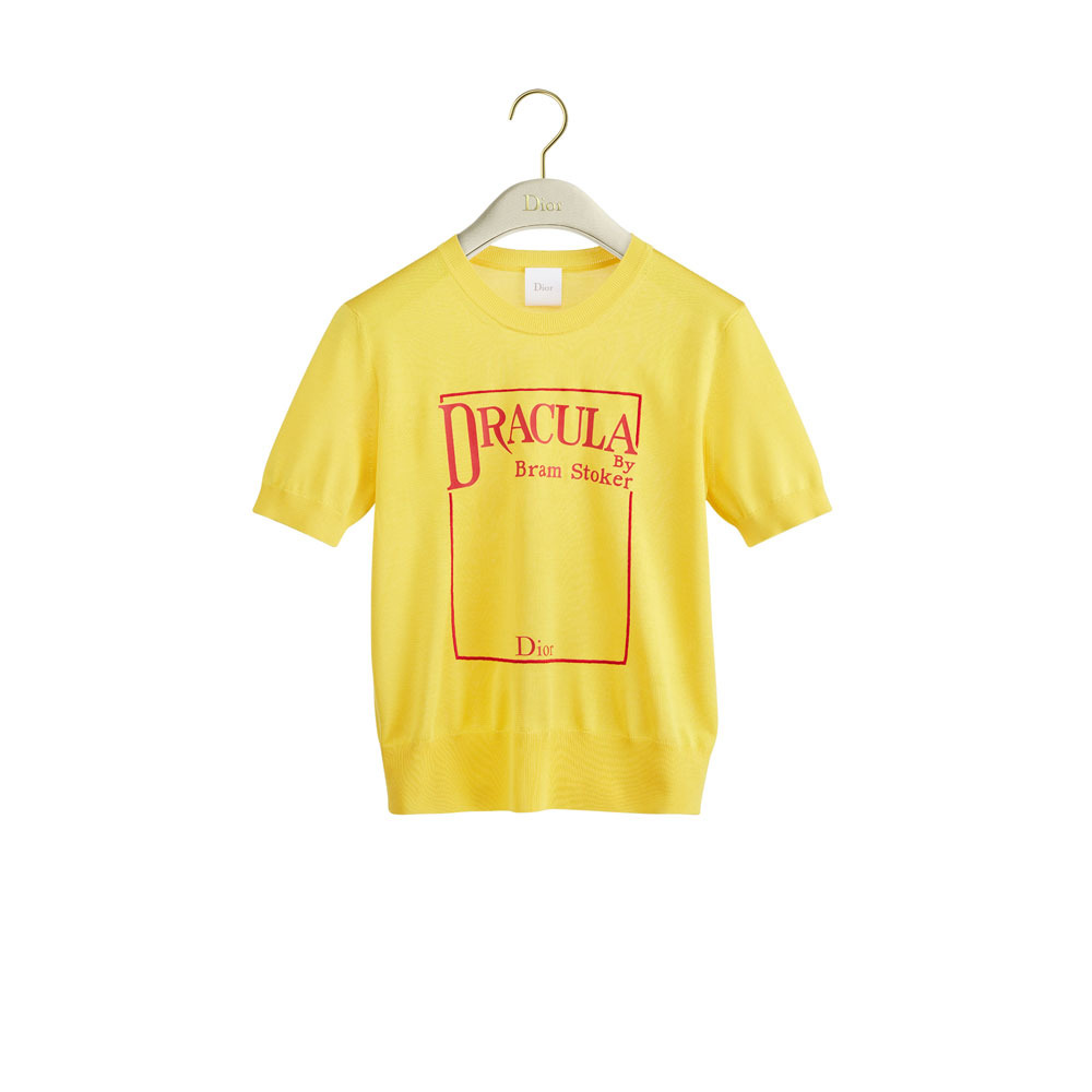 This unique piece features Bram Stoker's Dracula first edition cover design, part of Jonathan Anderson's literary collection. Crafted from lightweight red and yellow silk with ribbed edges.