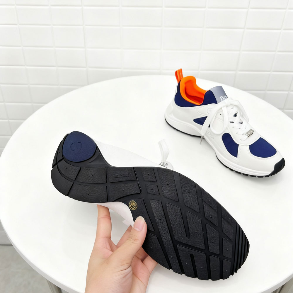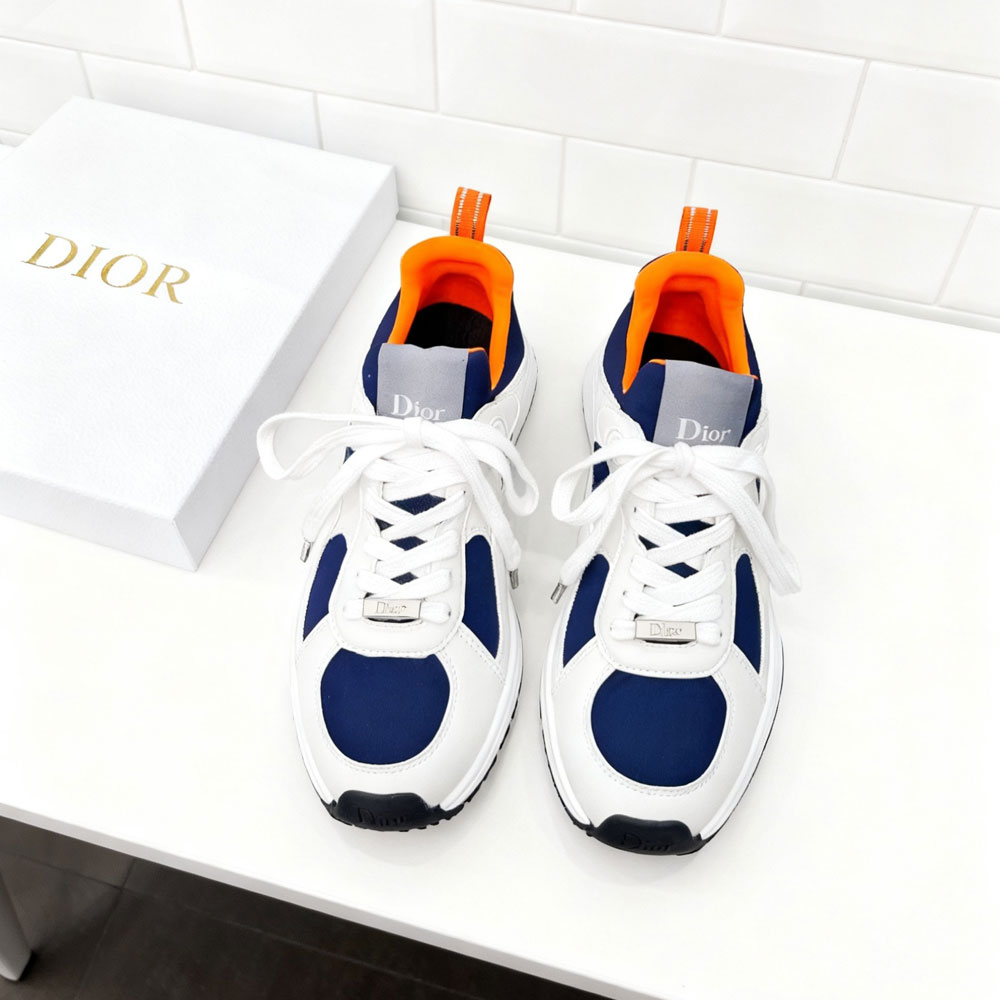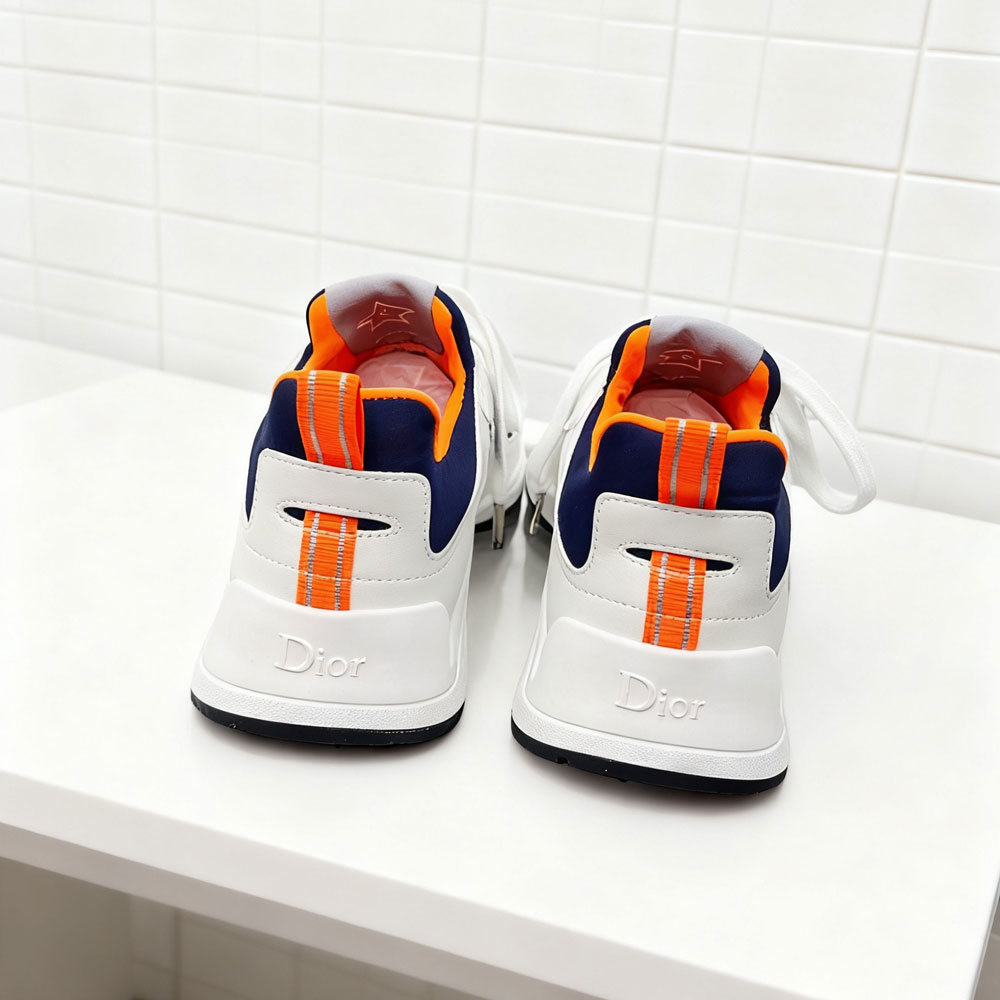 Featuring smooth white lambskin, these sneakers combine luxury with a sporty edge. The navy blue and orange neoprene accents add a bold contrast.