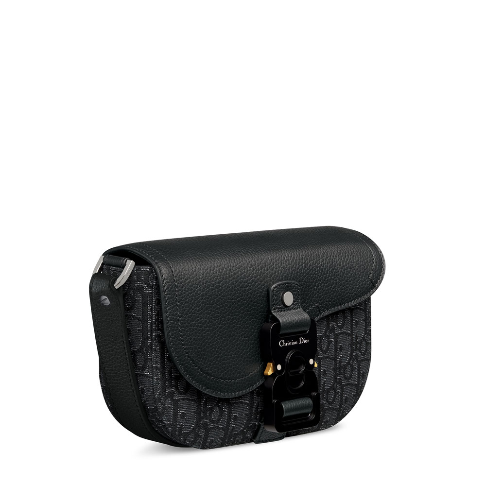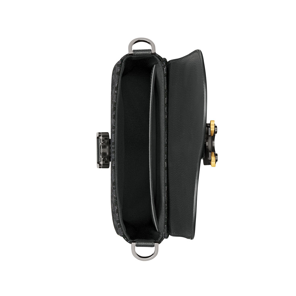 This compact messenger bag reinvents Dior's classic Saddle design with contemporary elegance. The black jacquard body features subtle silver metallic Dior Oblique pattern, topped with grained calfskin flap.