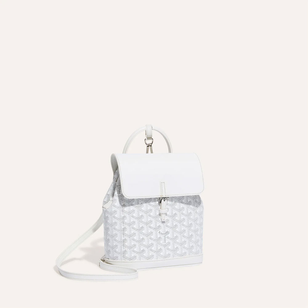 The White Goyard Alpin backpack displays adaptability with its smart attachments.