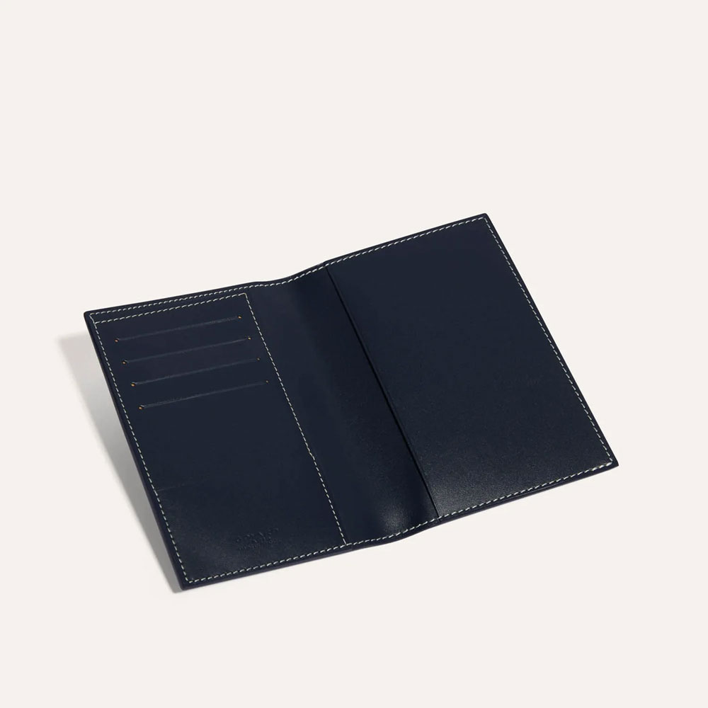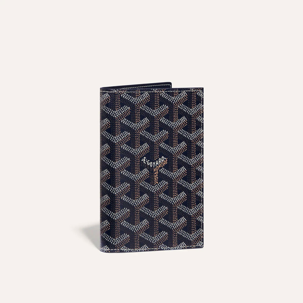 The navy blue Goyard travel wallet offers compact storage for essentials.