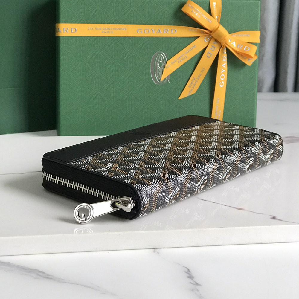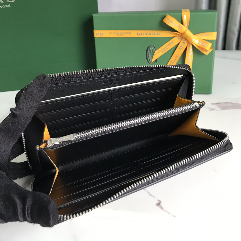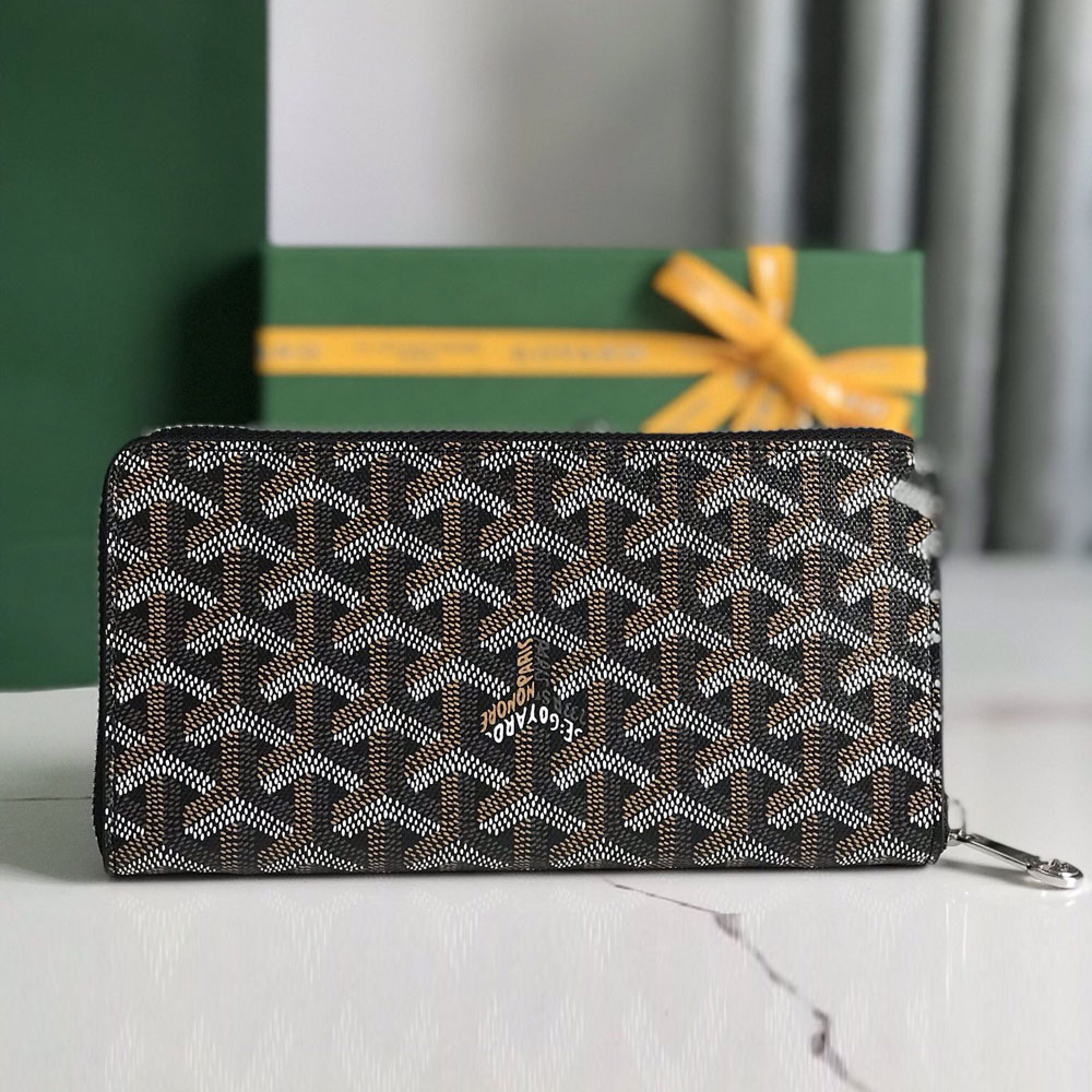 The stylish Goyard wallet features a secure zip closure for safe storage.