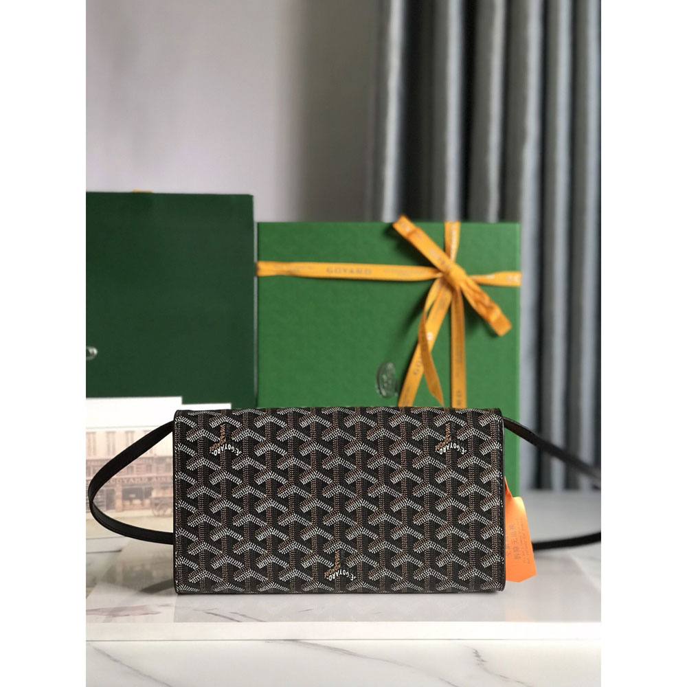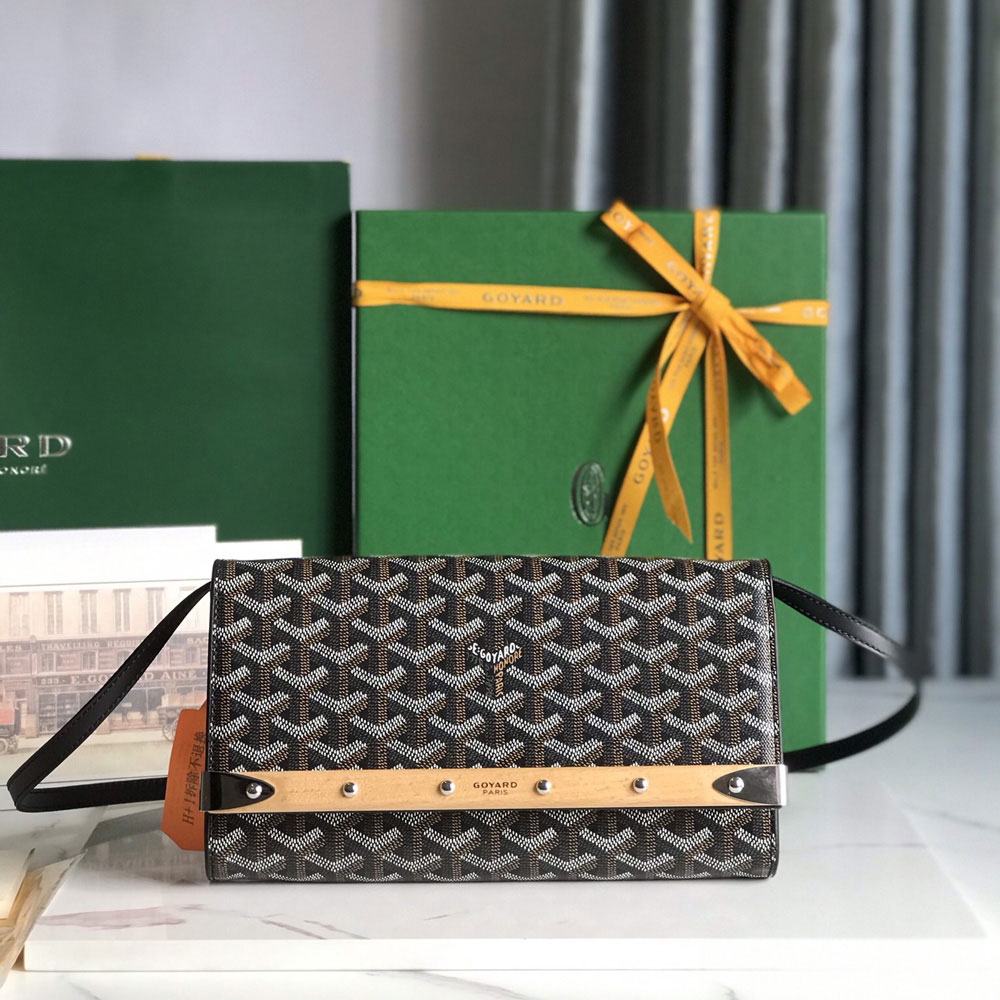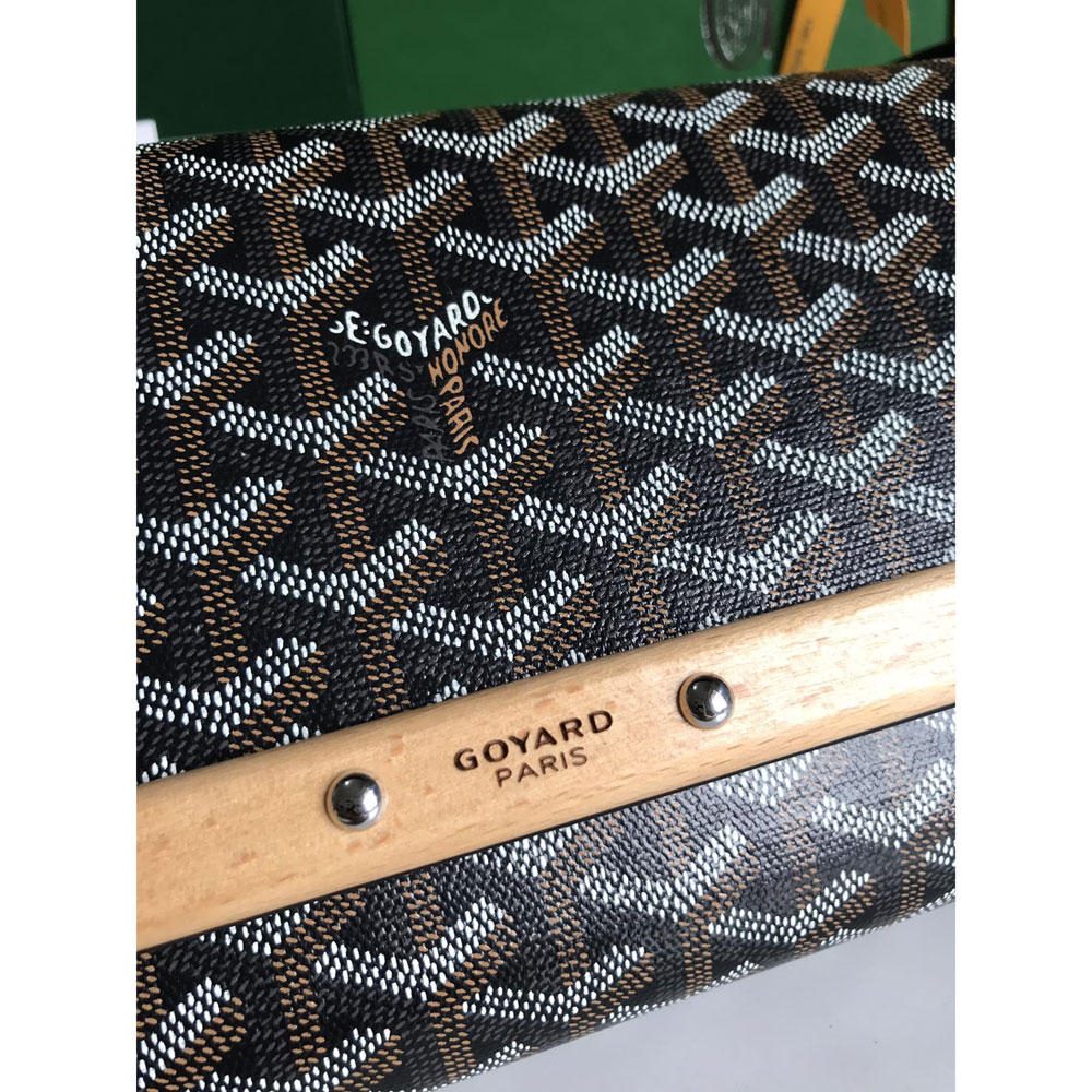 Featuring wooden rods and decorative rivets, this elegant clutch includes an adjustable strap for versatile wear.