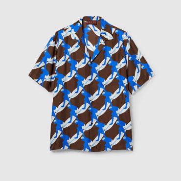 Silk shirts in brown, white, and oceanic blue reveal wave-rider motifs