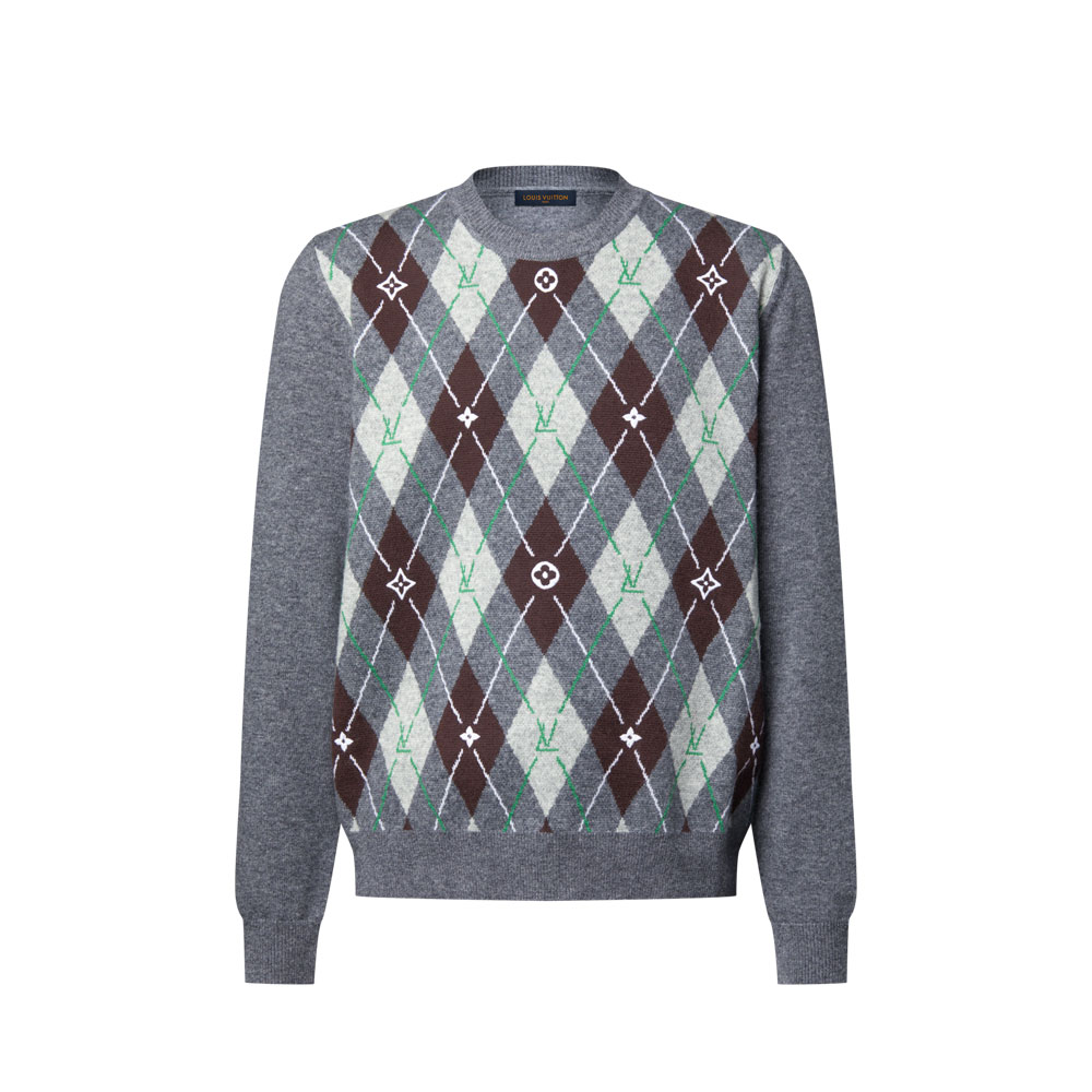 LV Argyle Sweater: This stylish grey crewneck from the FW 2025 collection showcases premium merino wool fabric.