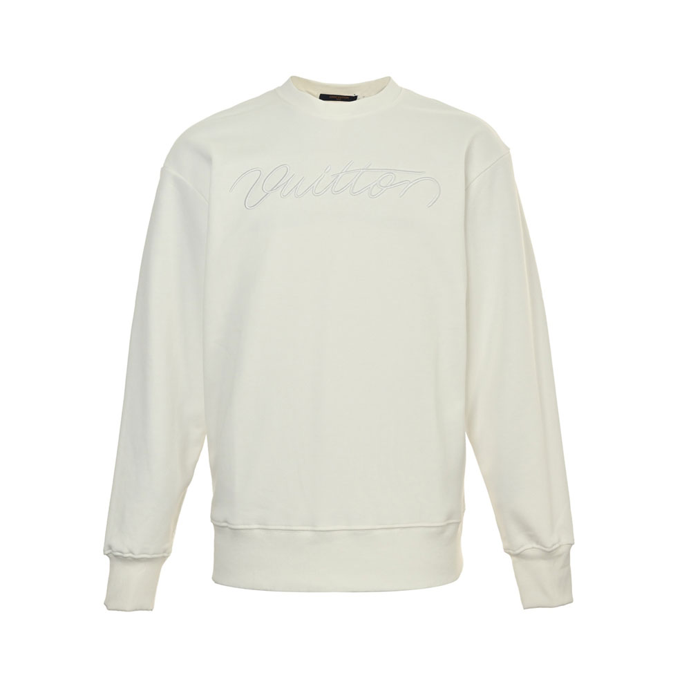 This stylish milky-white sweater features delicate embroidery showcasing the iconic brand signature.