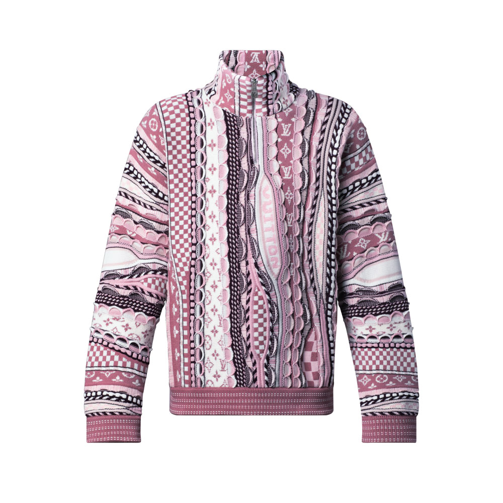 Louis Vuitton Half-Zip Sweater: Inspired by Y2K urban fashion, this light pink knit showcases LV's distinctive patterns woven into premium fabric.
