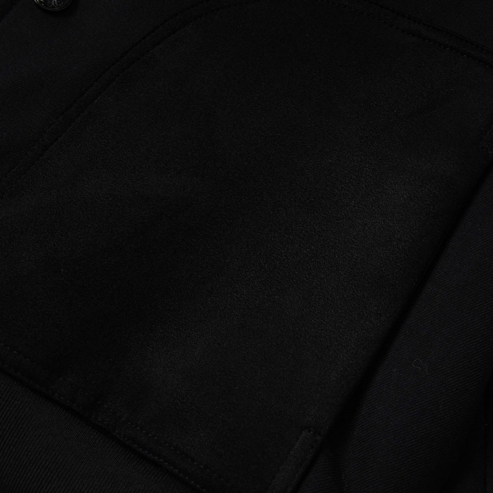 The stylish black jacket combines nubuck leather sleeves with wool fabric.
