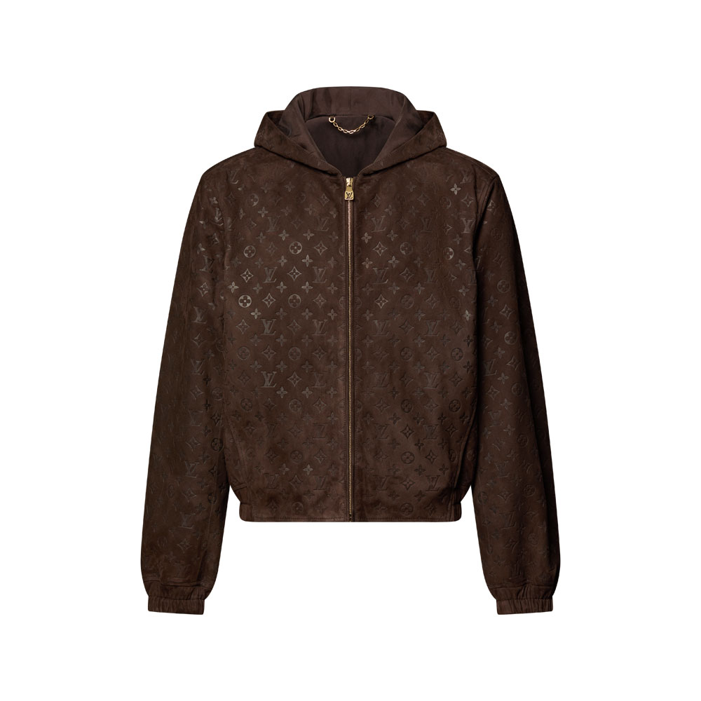 Louis Vuitton's butter-soft suede hoodie features an all-over Monogram embossed pattern, creating elegant texture contrasts.