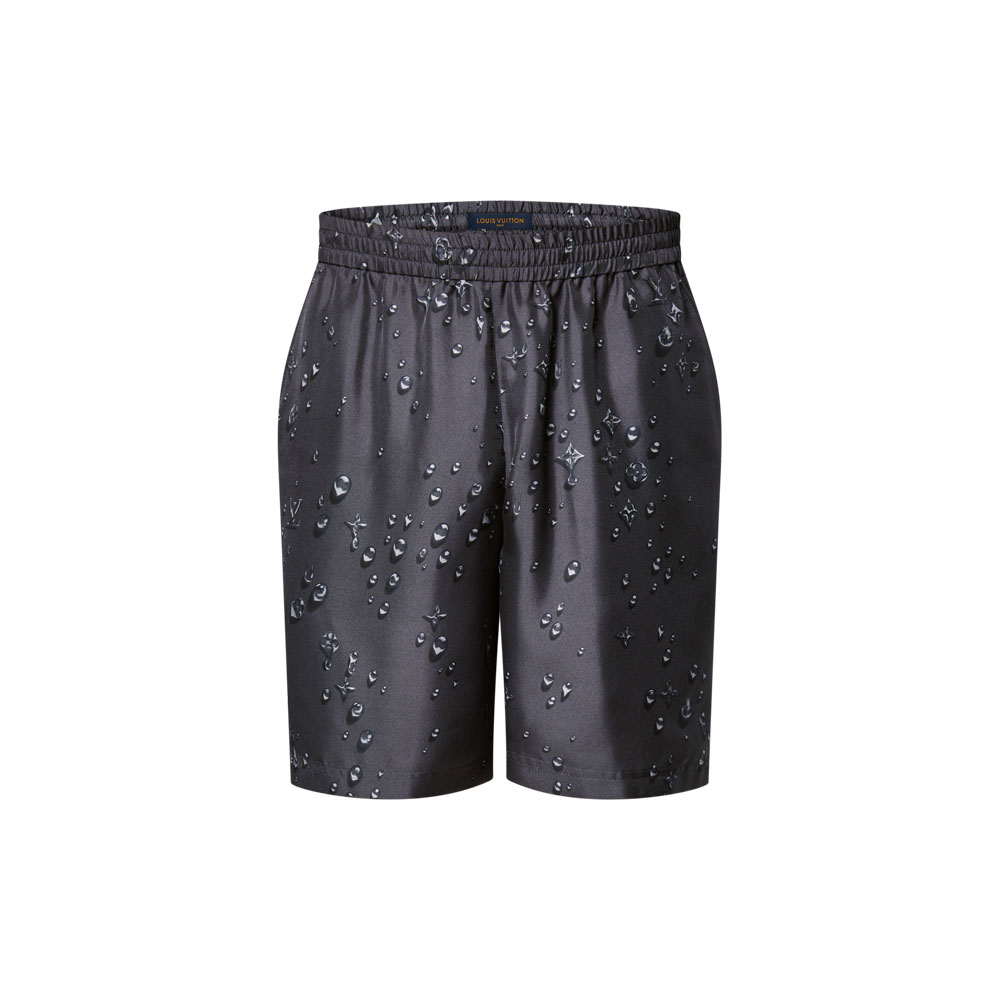 Experience luxury with Louis Vuitton's Monogram Silk Shorts. Made from smooth silk twill, these obsidian shorts feature a relaxed fit and elastic waistband for ultimate comfort. The playful Monogram Waterdrops print recreates the iconic LV pattern as artistic raindrops, inspired by British countryside weather.