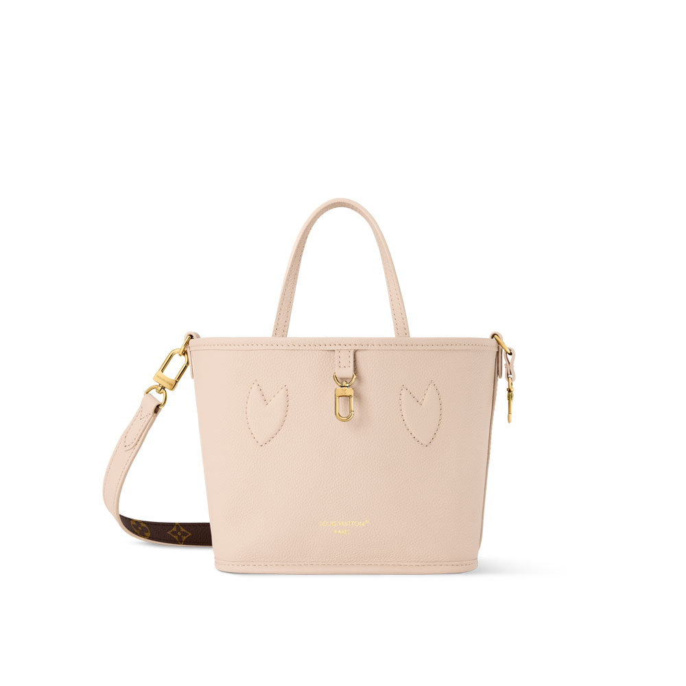 This special edition Louis Vuitton Neverfull BB tote offers dual-side versatility. Wear it with premium Limestone leather facing outward or reverse to display the iconic Monogram canvas. The bag includes a detachable zippered pouch that doubles as an exterior pocket. Shiny gold accents complete the sophisticated design.
