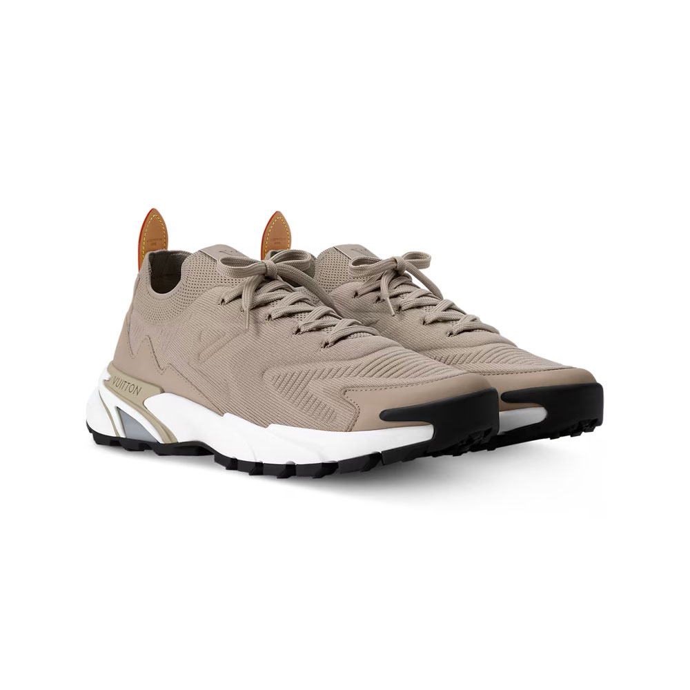 The LV Runner Tactic sneaker is made from one-piece technical knit, highlighted with textured accents and a side LV logo. It features calf-leather trim and a back tab inspired by LV luggage hardware. Designed for easy slip-on wear.