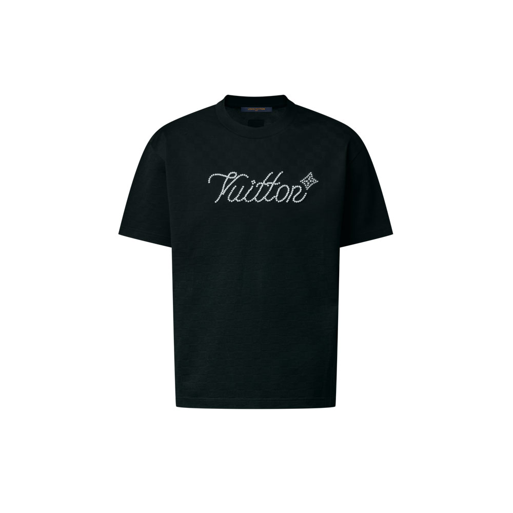 Introducing the Louis Vuitton Signature T-Shirt for men, crafted from premium black organic cotton. The refined design features an all-over Damier jacquard knit with subtle texture, accented by a pearlescent signature embroidery on the chest.