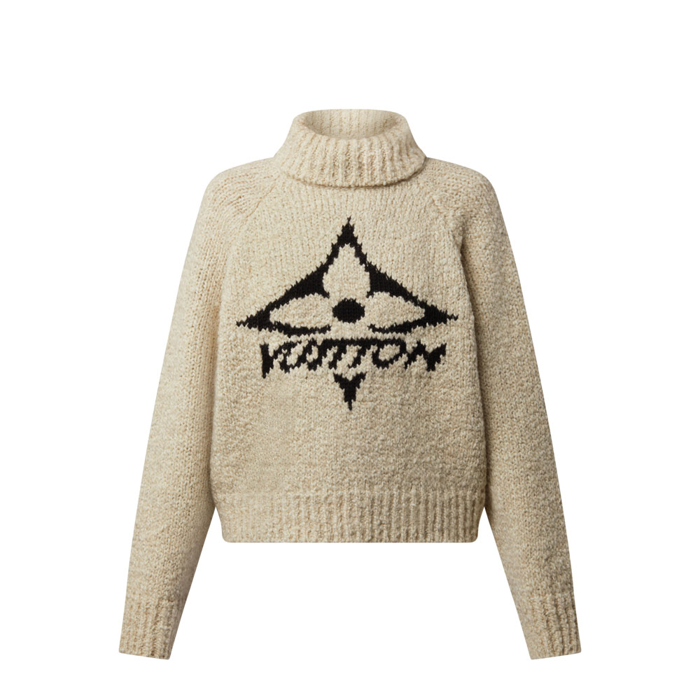 The chunky knit design features ribbed accents at the waist, cuffs, and turtleneck collar for a polished look. A bold Monogram Flower motif adorns the chest, adding signature Louis Vuitton flair.