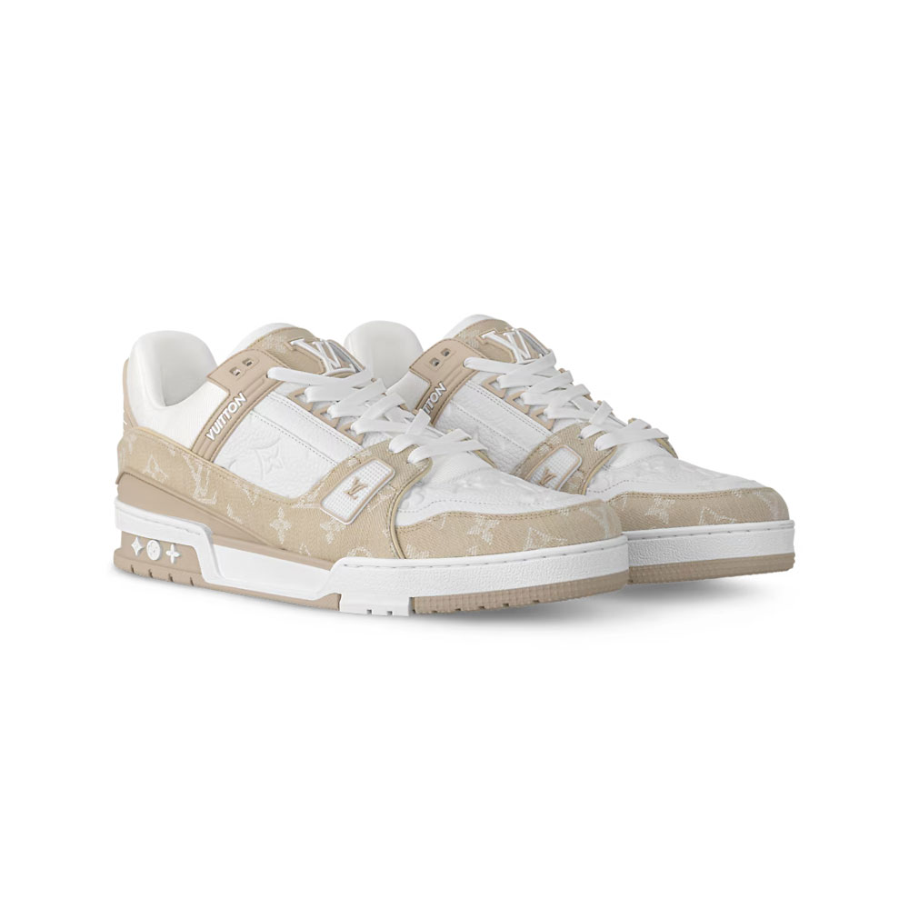 This LV Trainer reworks cult sneaker with Monogram denim and grained calf leather. Originally by Virgil Abloh, its two?tone upper contrasts colors and textures. Details include rubber LV signatures and a dual-tone outsole with Monogram Flowers.