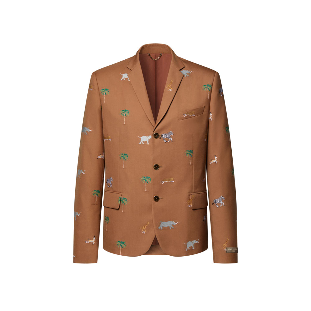 Discover this elegant single-breasted wool jacket in caramel. Featuring the signature LV x The Darjeeling motif from SS 2026, its textured fil coupe jacquard showcases vibrant patterns throughout.