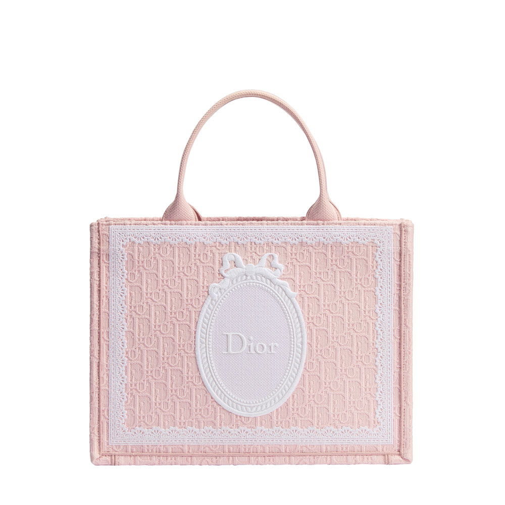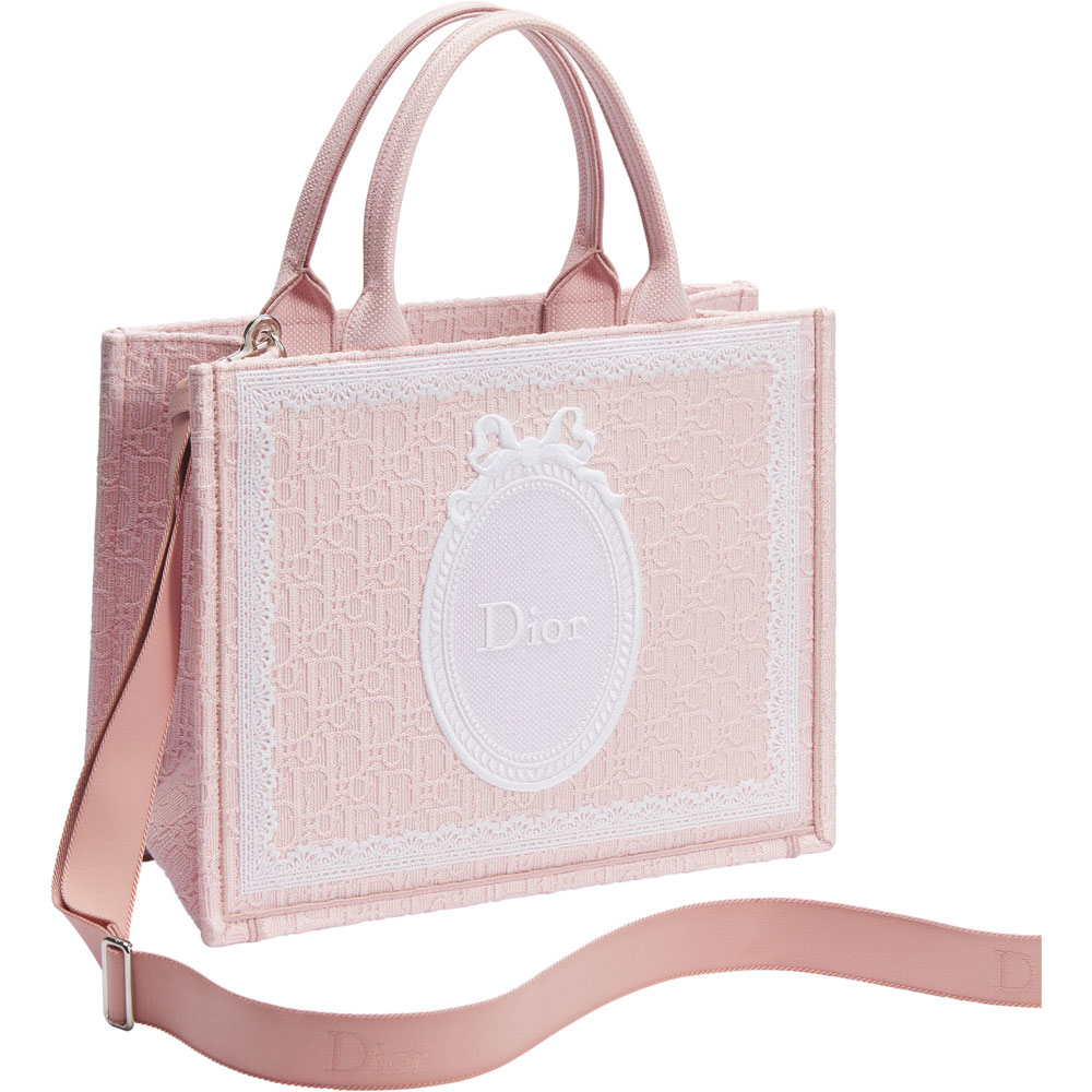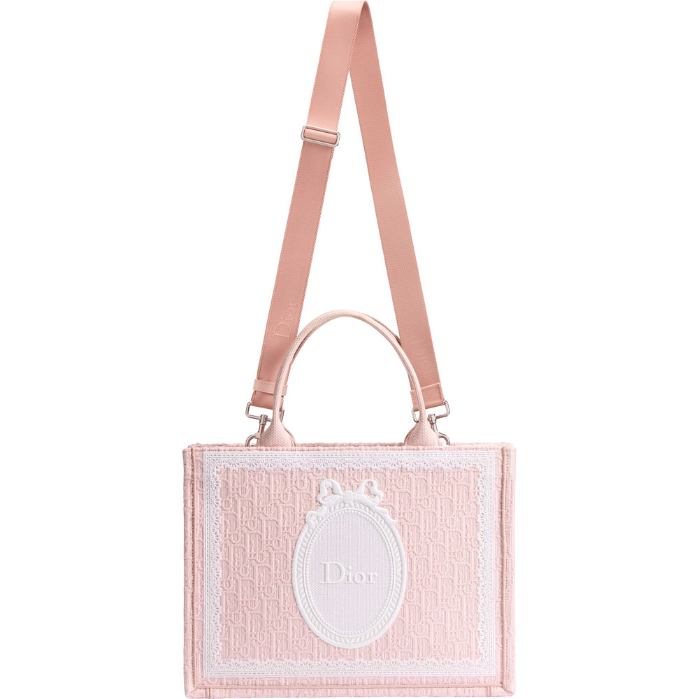 This elegant Book Tote features the iconic Dior Oblique jacquard pattern, beautifully framed with delicate lace. The front displays the signature Dior Medaillon design.