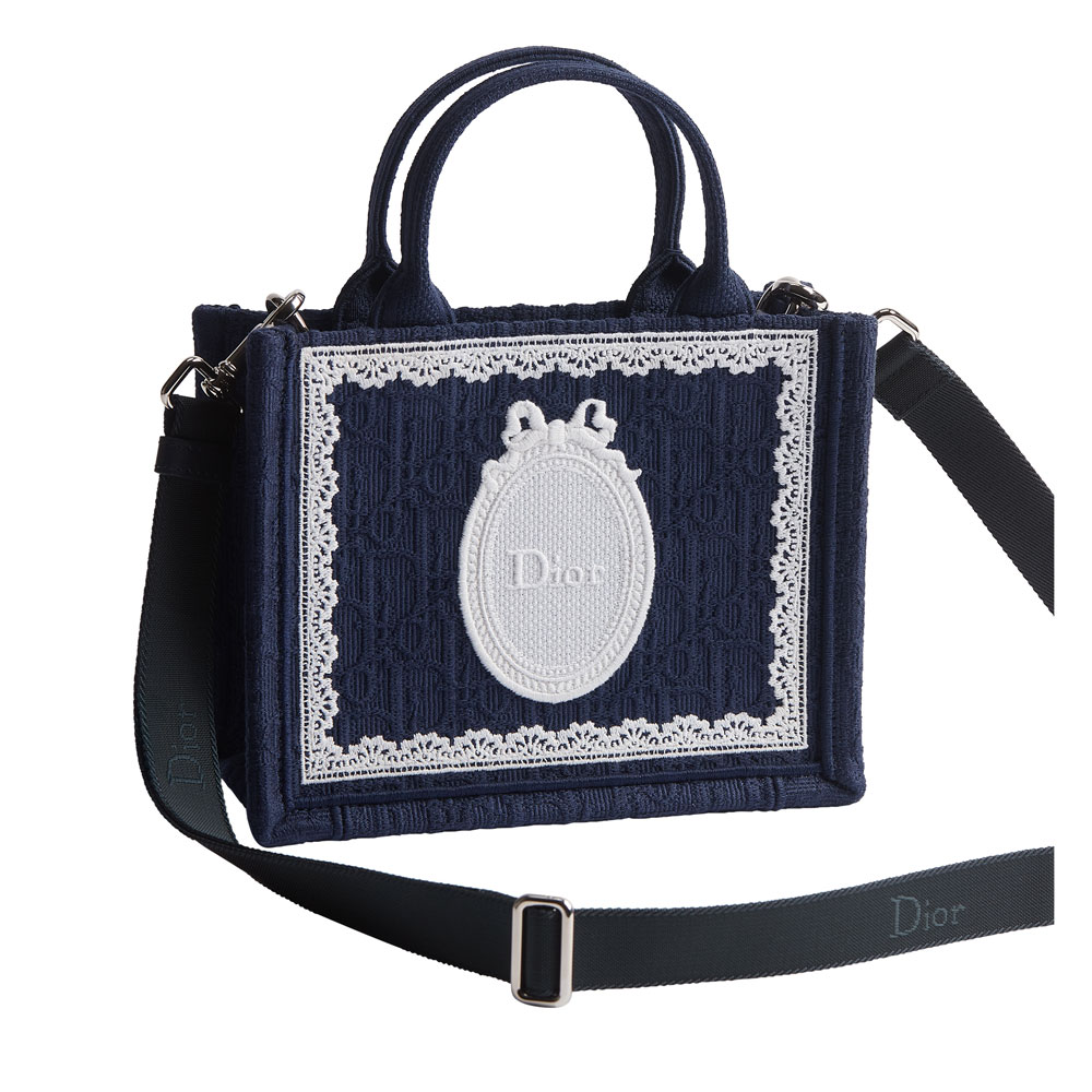This exquisite mini tote reinterprets the classic Dior Book design with elegant Oblique jacquard and delicate lace accents. Featuring the iconic Dior Medaillon signature, it combines timeless luxury with contemporary charm.